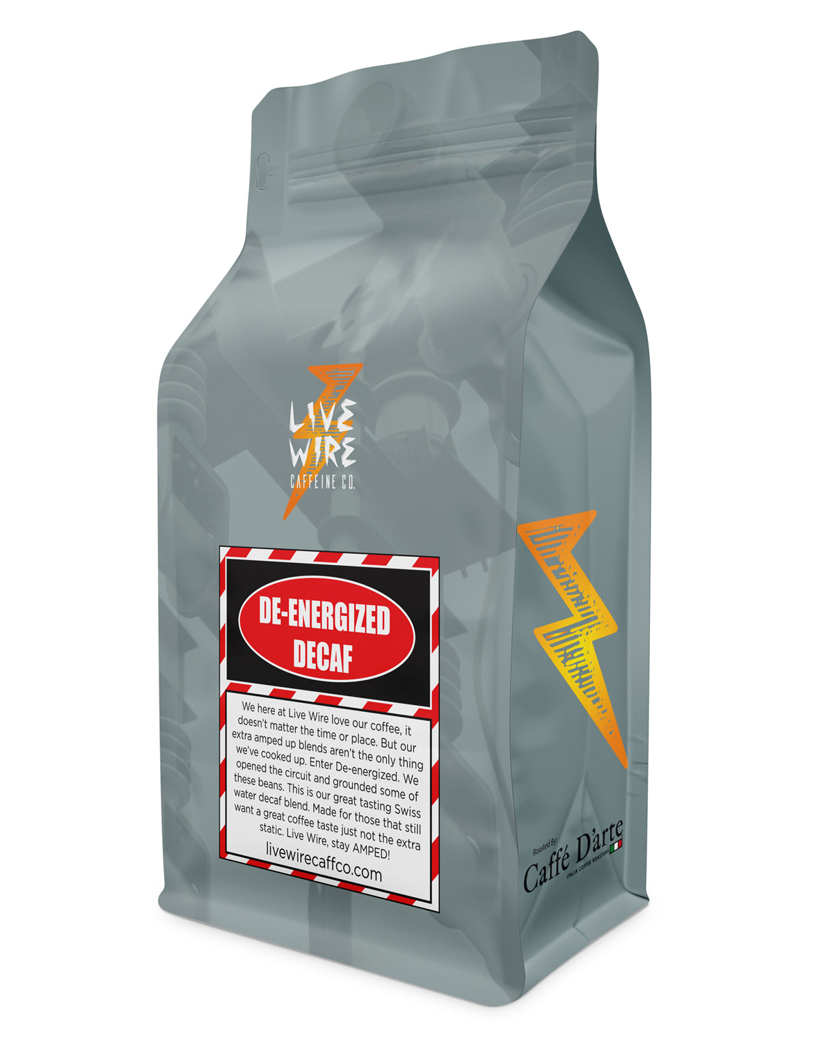 De-Energized Decaf Blend: We here at LiveWire love our coffee, it doesn’t matter the time or place. But our extra amped up blends aren’t the only thing we’ve brewed up! Enter De-energized. We opened the circuit and grounded some of these beans! This is our great tasking Swiss water decaffeinated blend.
